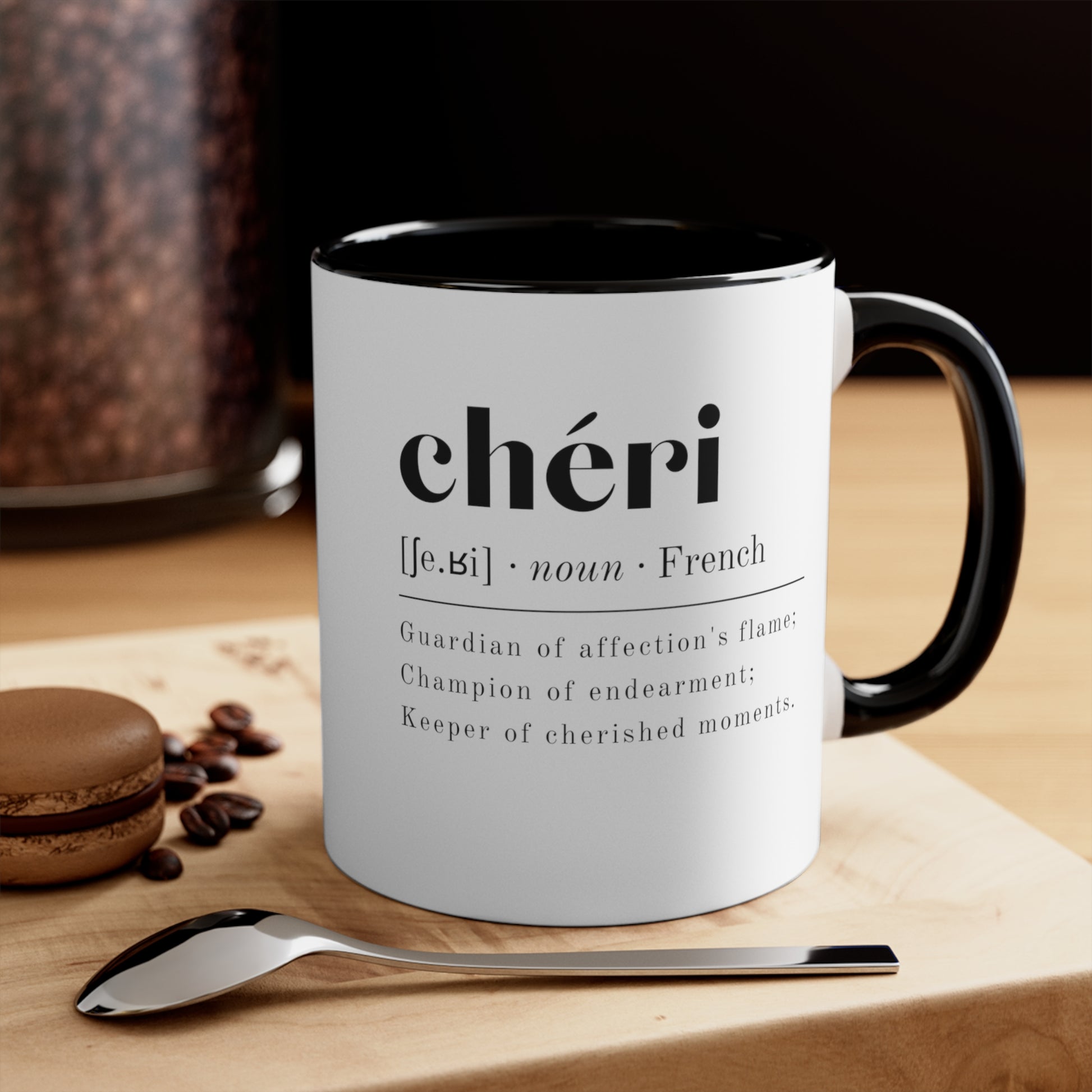 Introducing our Chéri-themed mug, an eloquent expression of endearment crafted in ceramic. Decorated with the word "Chéri" and a poetic definition - "Guardian of affection's flame; Champion of endearment; Keeper of cherished moments." Enrich your daily rituals with this captivating mug, seamlessly intertwining artistic allure and heartfelt sentiment. Tailored for treasured moments and meaningful gifting, it embodies the essence of romantic connection. Immerse yourself in the tender allure with every sip, allowing the sweetness of affection to linger.