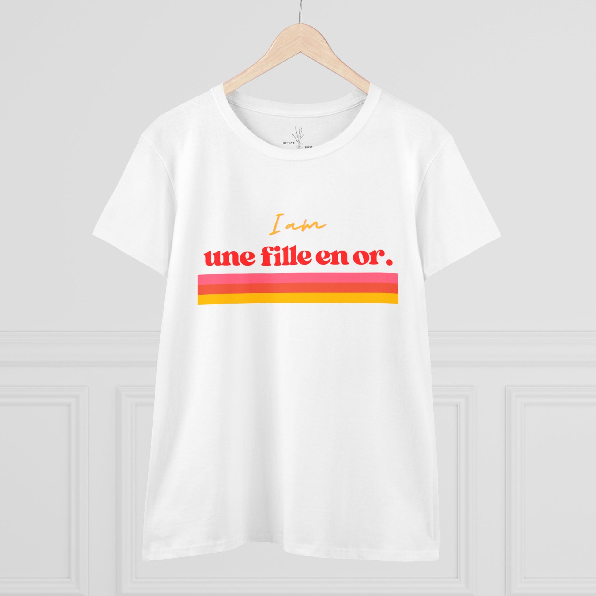 Discover our exclusive creation at Octave & Rose (OR): the "I am une fille en or" t-shirt. "Une fille en or" is a French expression that means a person is exceptional, precious, and valuable like gold. It implies that the person is admirable, talented, generous, and possesses qualities that make them special and cherished in the eyes of others. It's a way of saying that this person is truly special and precious.