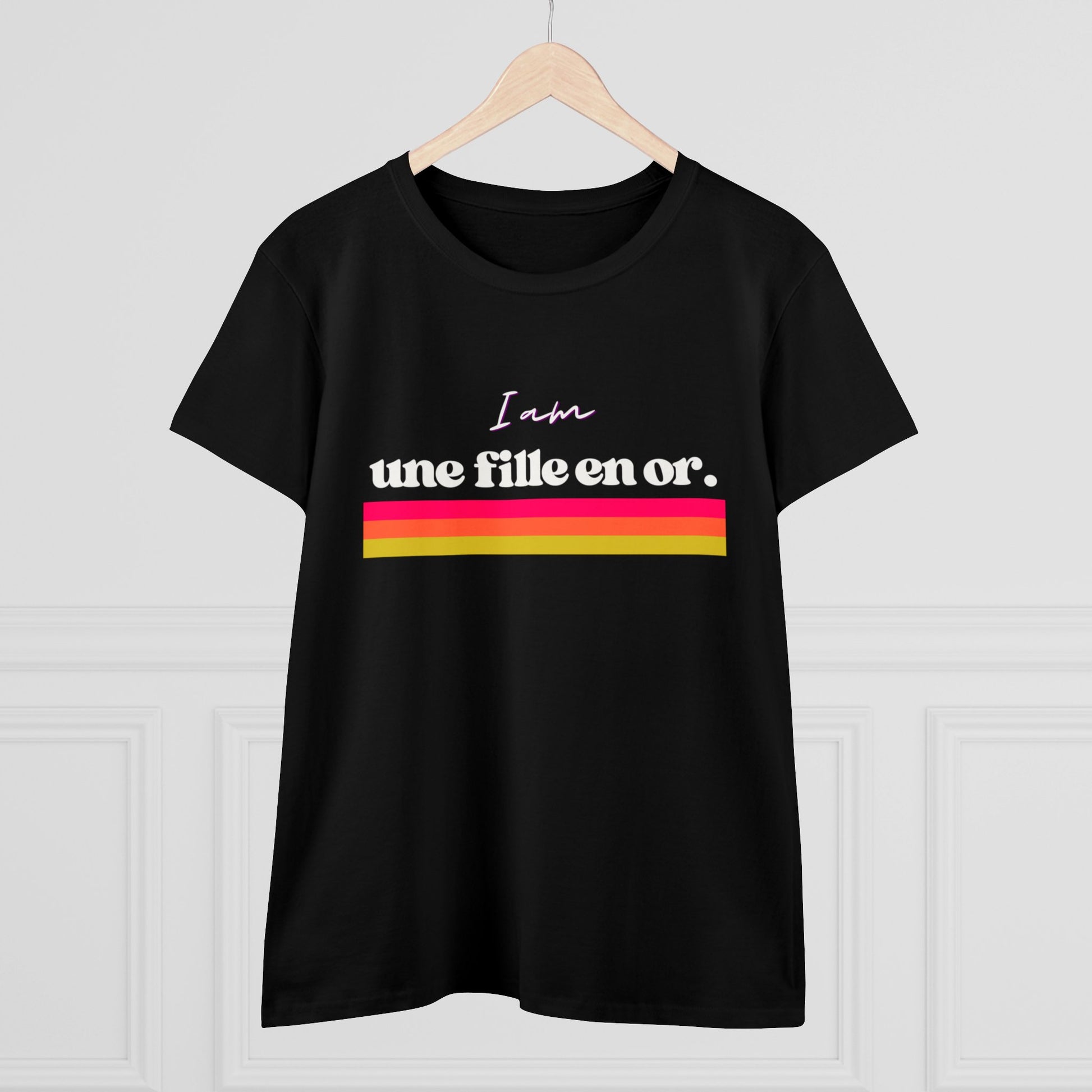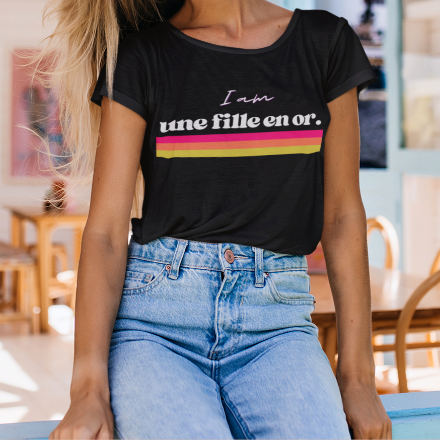 Discover our exclusive creation at Octave & Rose (OR): the "I am une fille en or" t-shirt. "Une fille en or" is a French expression that means a person is exceptional, precious, and valuable like gold. It implies that the person is admirable, talented, generous, and possesses qualities that make them special and cherished in the eyes of others. It's a way of saying that this person is truly special and precious.