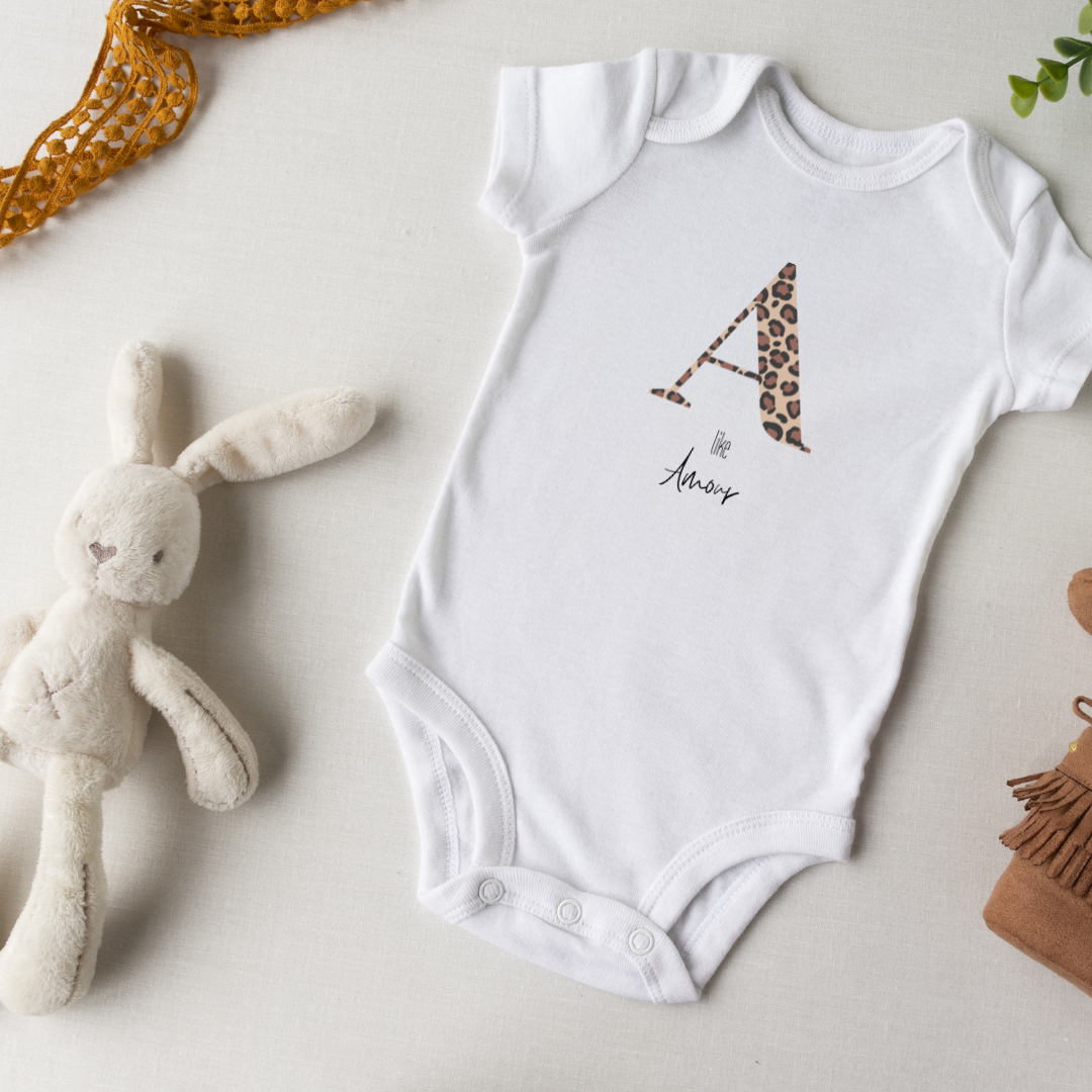 This cute baby organic baby bodysuit, we love these leopard initials. It's a modern and timeless pattern at the same time. It's up to you to choose the initial and the text of your choice.