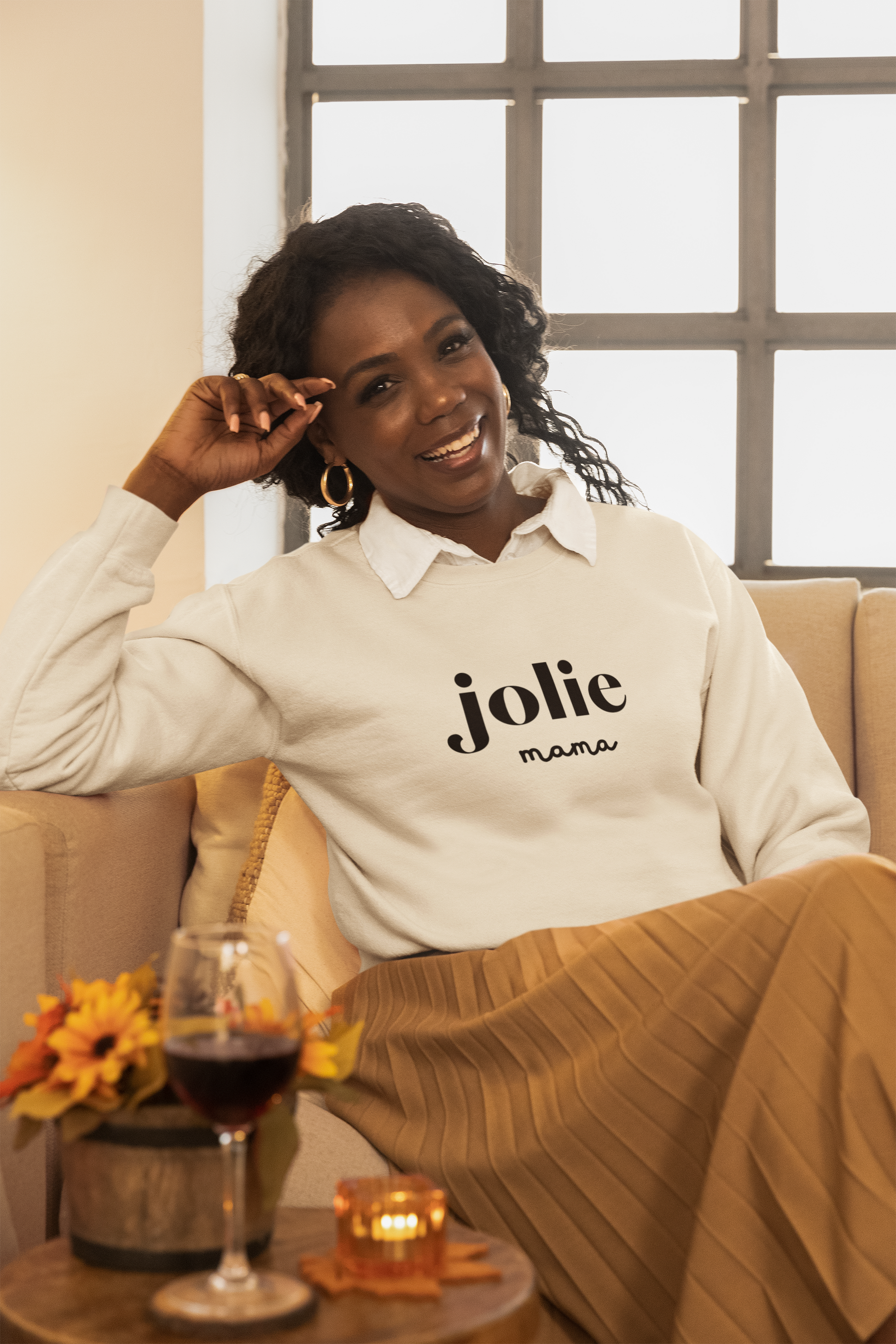 Our much-anticipated 'Jolie Mama' sweater has arrived! 💕 For those of you wondering, 'Jolie' in French means 'pretty' or 'lovely' - and we couldn't agree more! 😍 But wait, there's more! So get ready to be both 'Jolie' and 'Jolly' this holiday season with our fabulous new sweater! 🎉