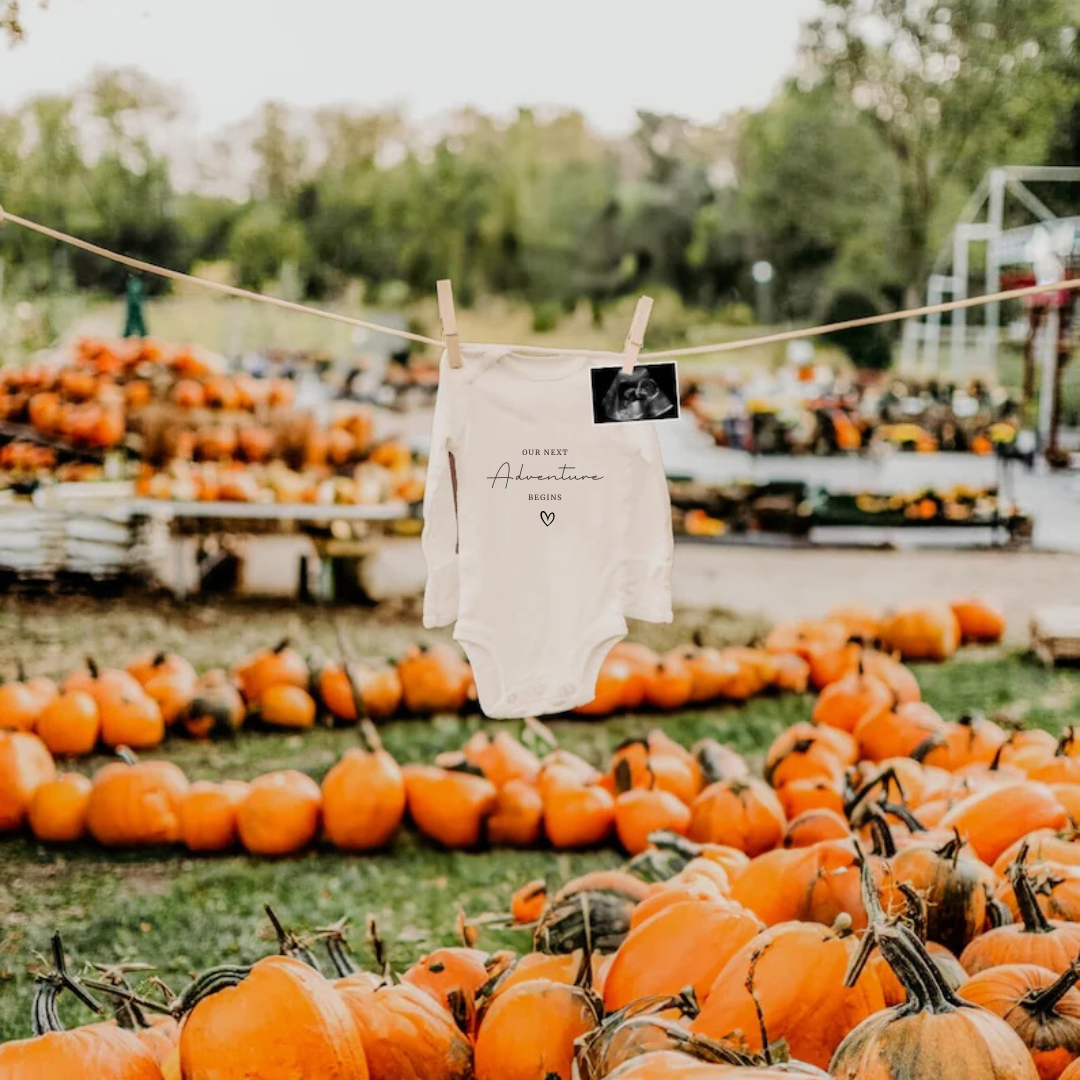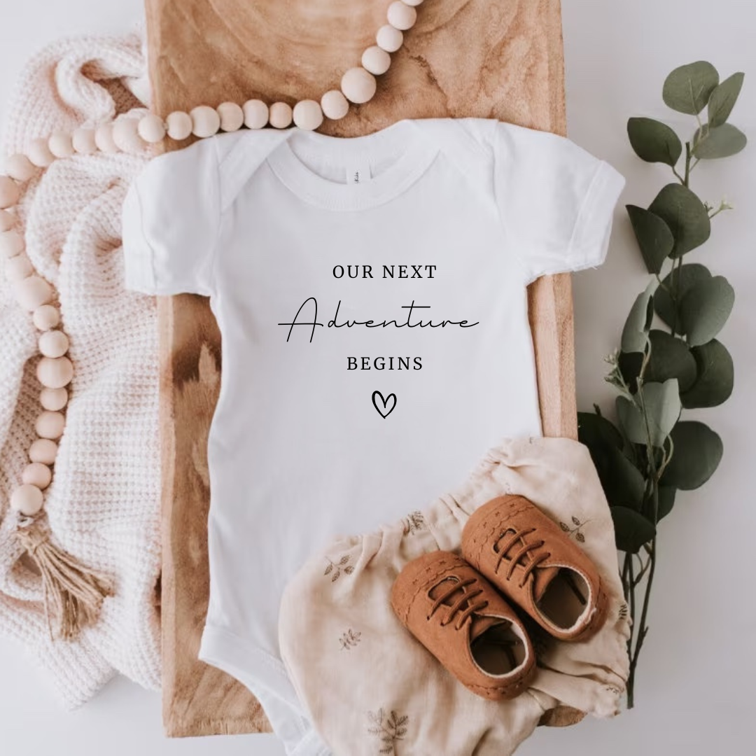 Are you eagerly awaiting the arrival of a new bundle of joy? Want to announce this incredible journey in style? Look no further! Our adorable custom baby bodysuit featuring the heartwarming phrase "Our Next Adventure Begins" is the perfect way to share your exciting news with family and friends.