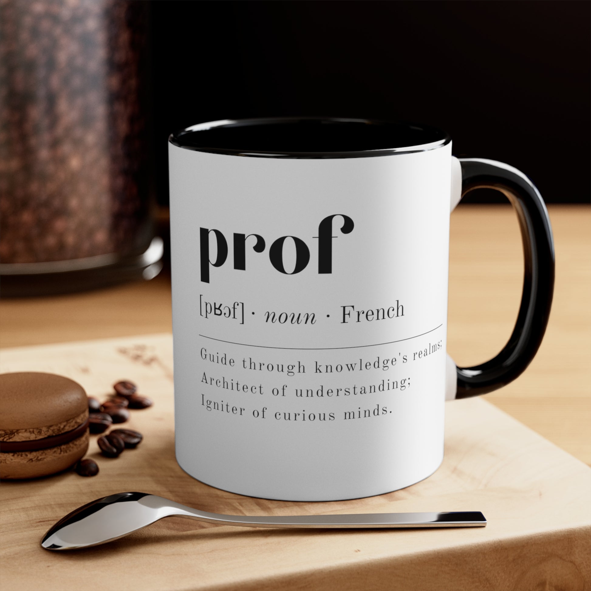 Introducing our Prof-themed mug, a scholarly celebration encapsulated in ceramic. Embellished with the word "Prof" and a scholarly definition -"Guide through knowledge's realms; Architect of understanding; Igniter of curious minds." Transform your daily contemplations with this captivating mug, a seamless fusion of intellect and aesthetics. Perfect for moments of reflection and thoughtful gifting. Immerse yourself in the erudite spirit with every sip, embracing the profound essence of knowledge.