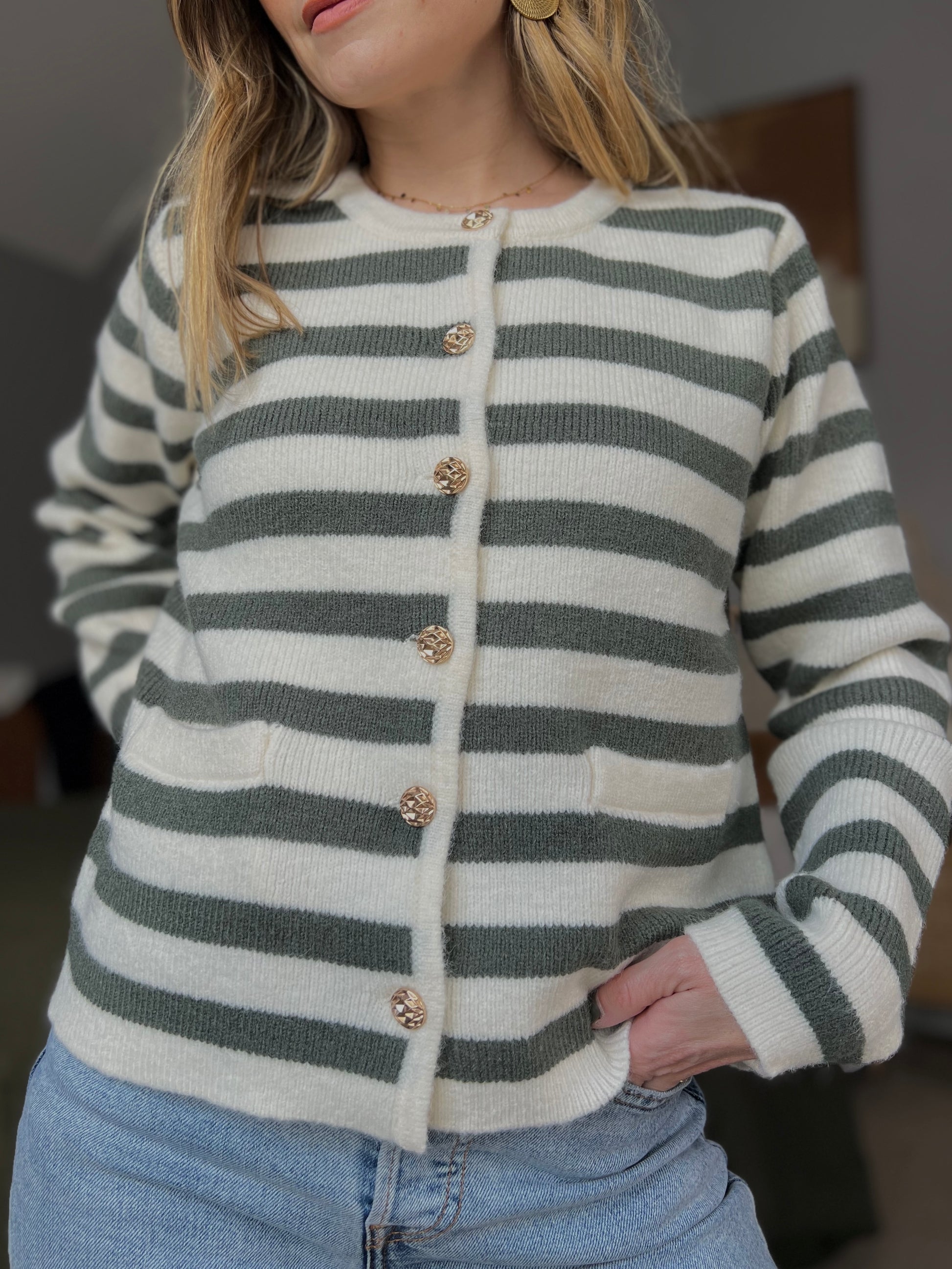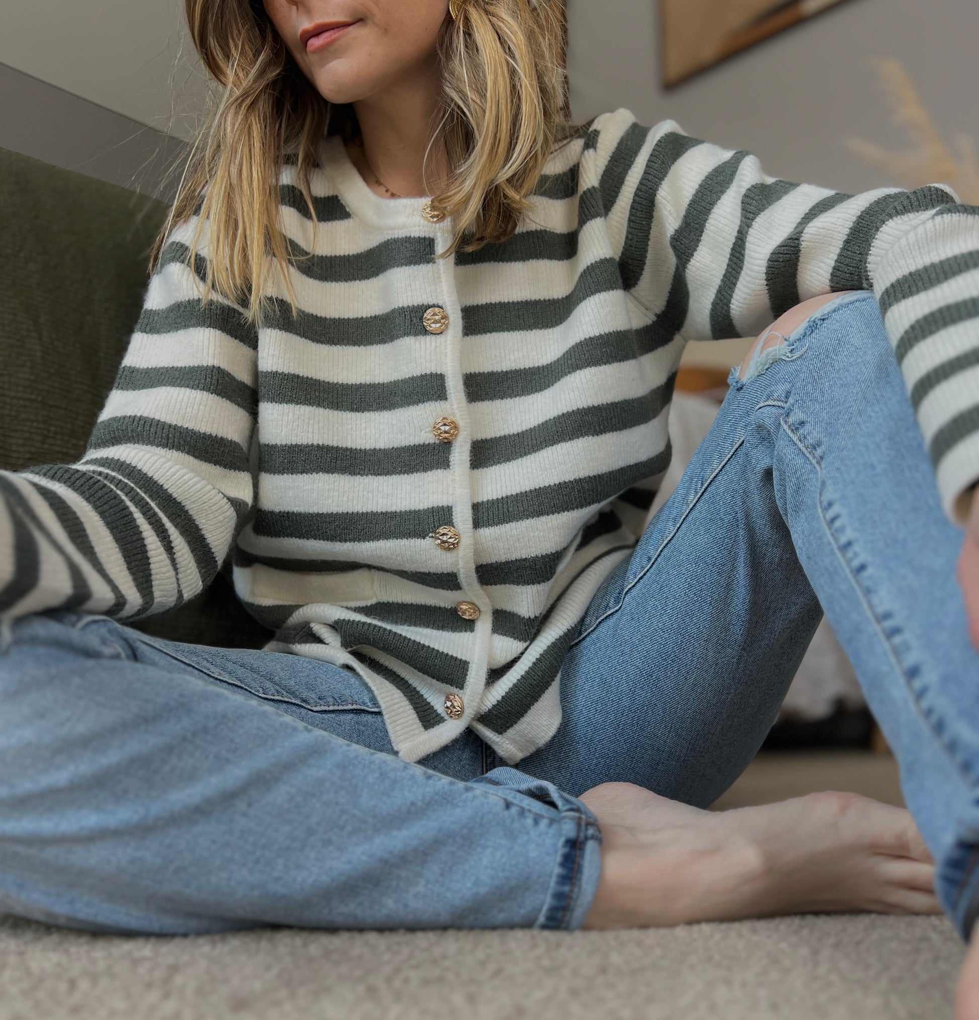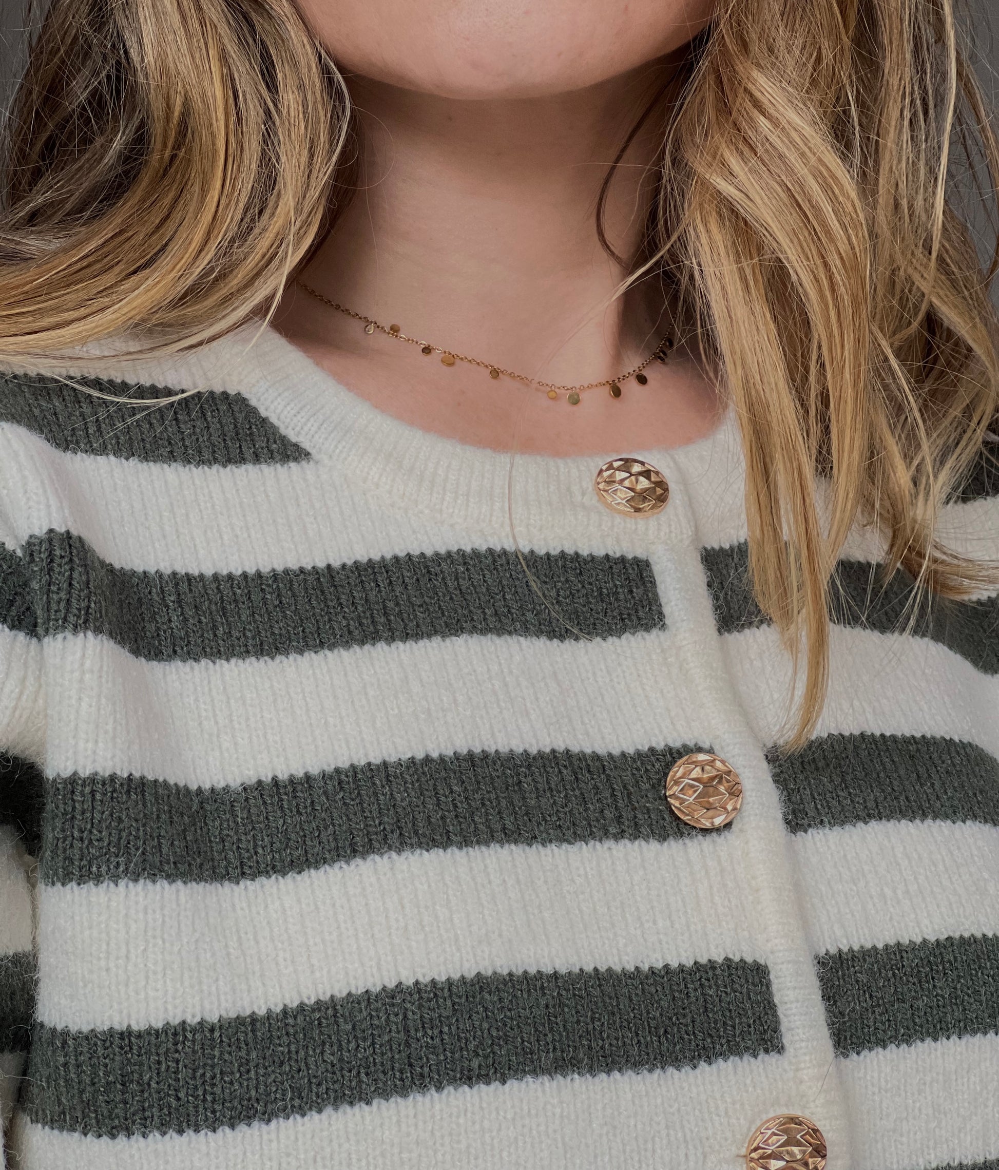 Look effortlessly stylish in this lightweight khaki and white striped cardigan with long sleeves, golden buttons, slightly cropped and slightly loose fit. Perfect for any season!